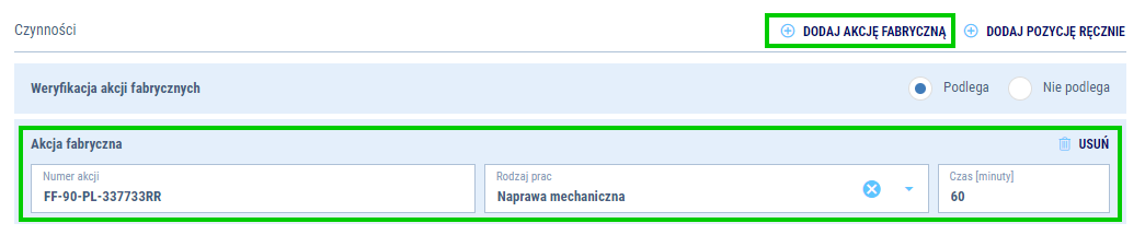 - Wymagane jest określenie, czy dany pojazd podlega Akcji fabrycznej. Jeżeli tak - koniecznie dodaj ją do naprawy.