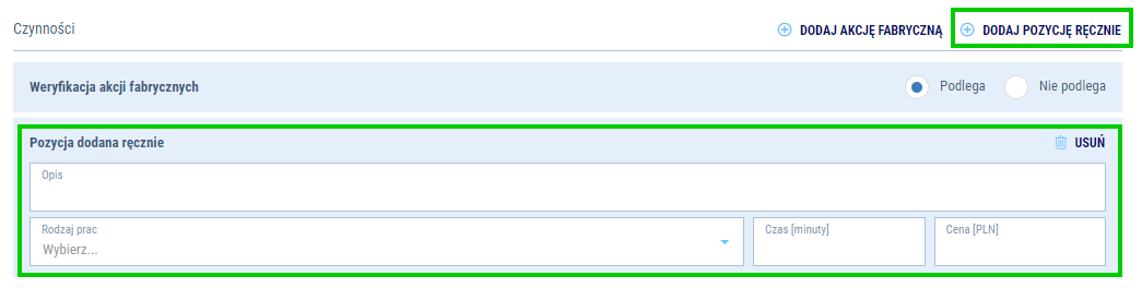 - Możesz wprowadzić dodatkowe pozycje prac przy pomocy operacji
