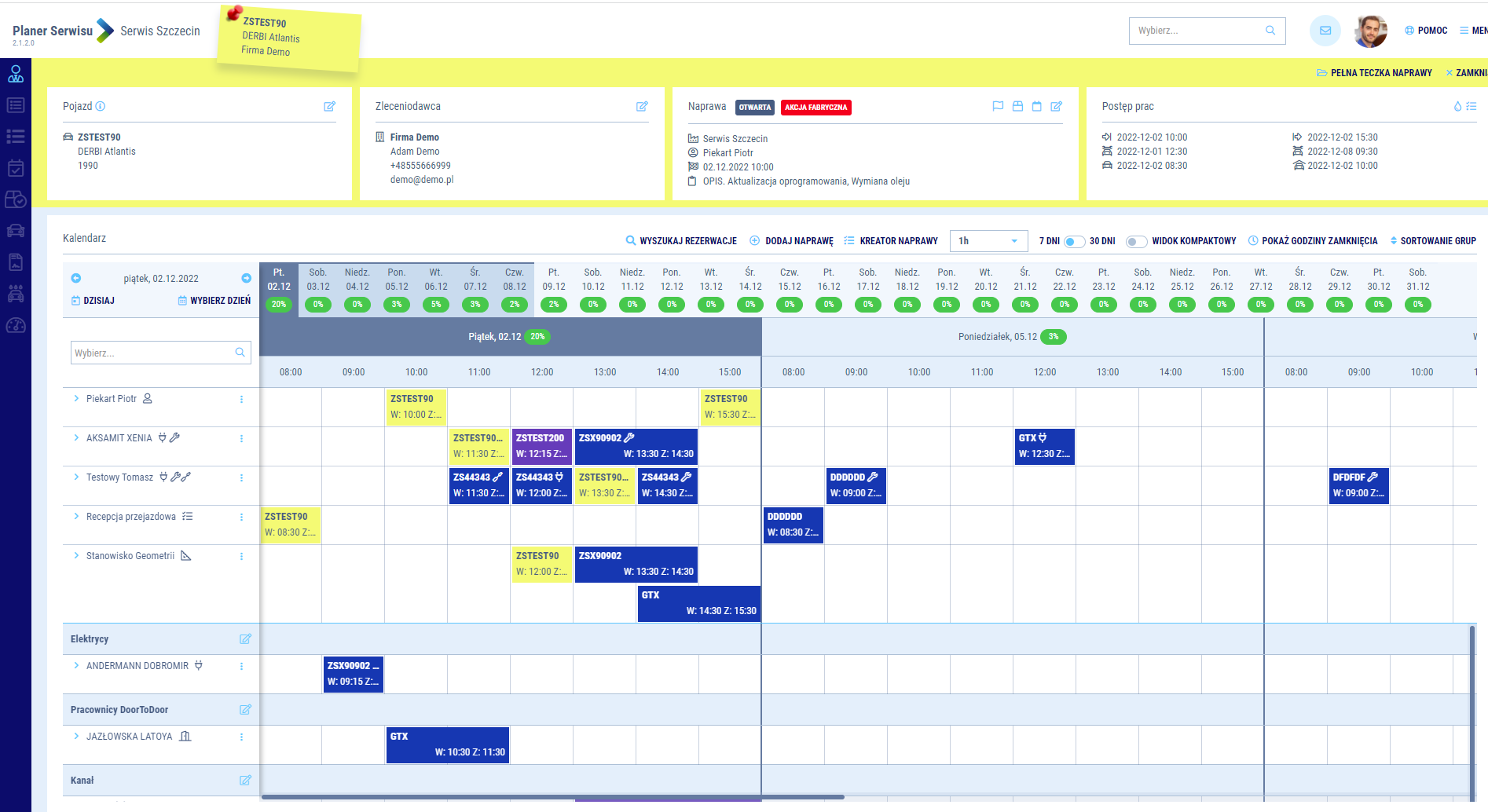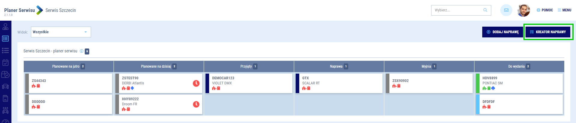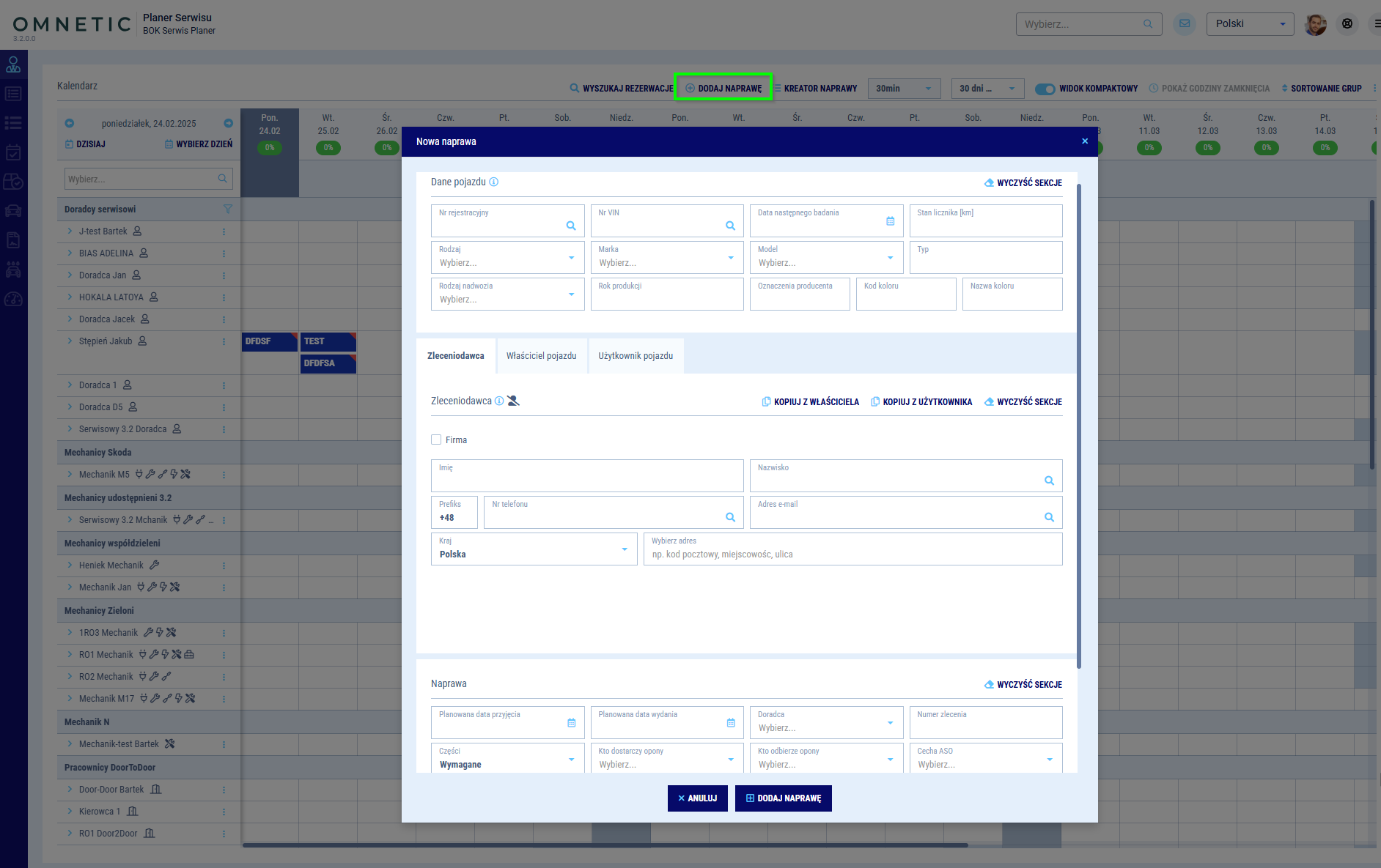 Kreator naprawy na podstawie wprowadzonych danych, automatycznie utworzy naprawę i zarezerwuje niezbędne zasoby (mechaników, doradców, kierowców i stanowiska). Kreator wspiera optymalne planowanie mechaników oraz innych niezbędnych zasobów i stanowisk.