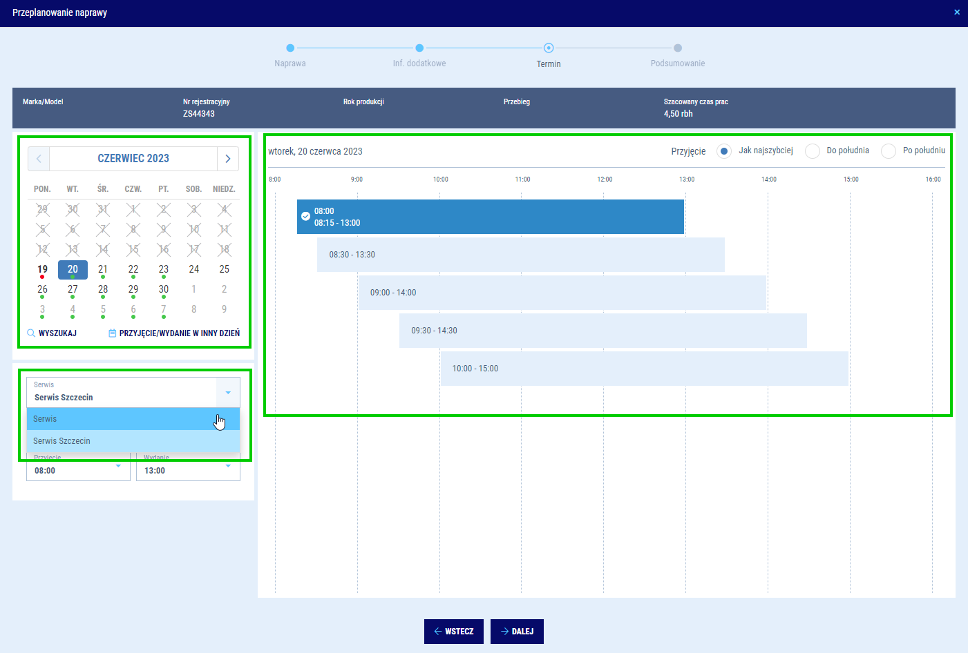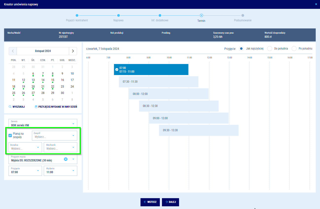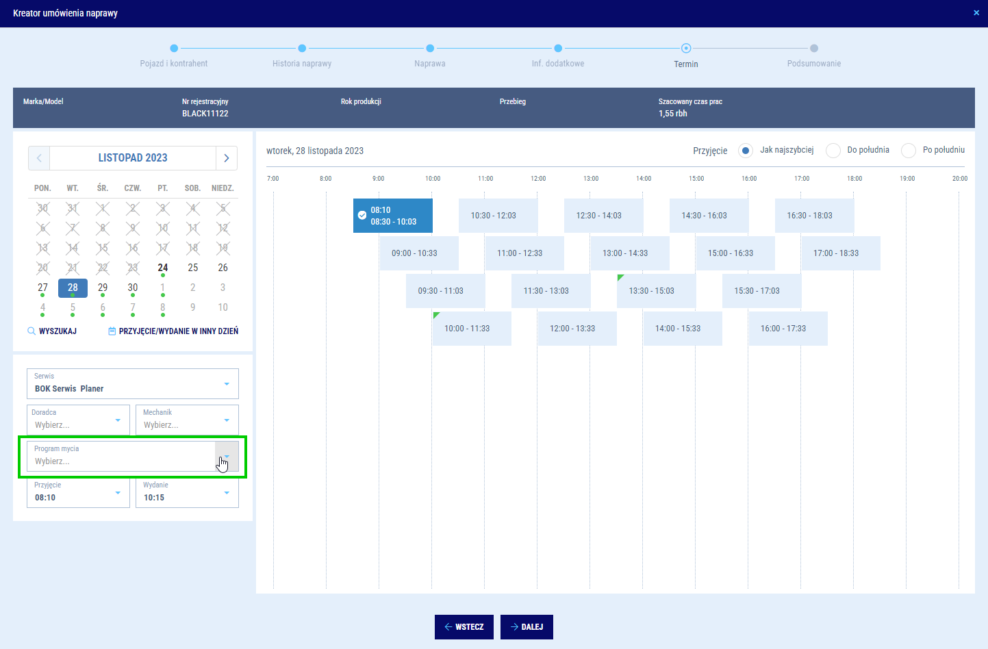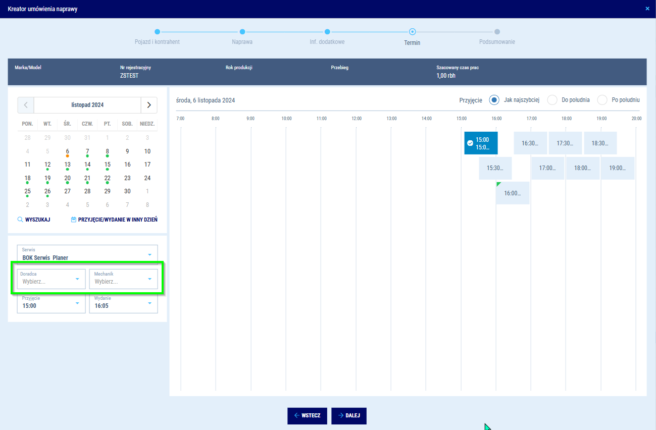 System będzie samodzielnie proponował Ci najbardziej optymalne terminy biorąc, pod uwagę dostępność doradców i mechaników. Jeżeli jednak zależy Ci, aby naprawa trafiła do konkretnego doradcy lub mechanika, to masz możliwość wskazania ich manualnie. Proponowane terminy ulegną zmianie adekwatnie do dostępności wybranych zasobów. Możesz również wybrać inny niż domyślny program mycia, jakie będzie zaplanowane dla naprawianego auta.
