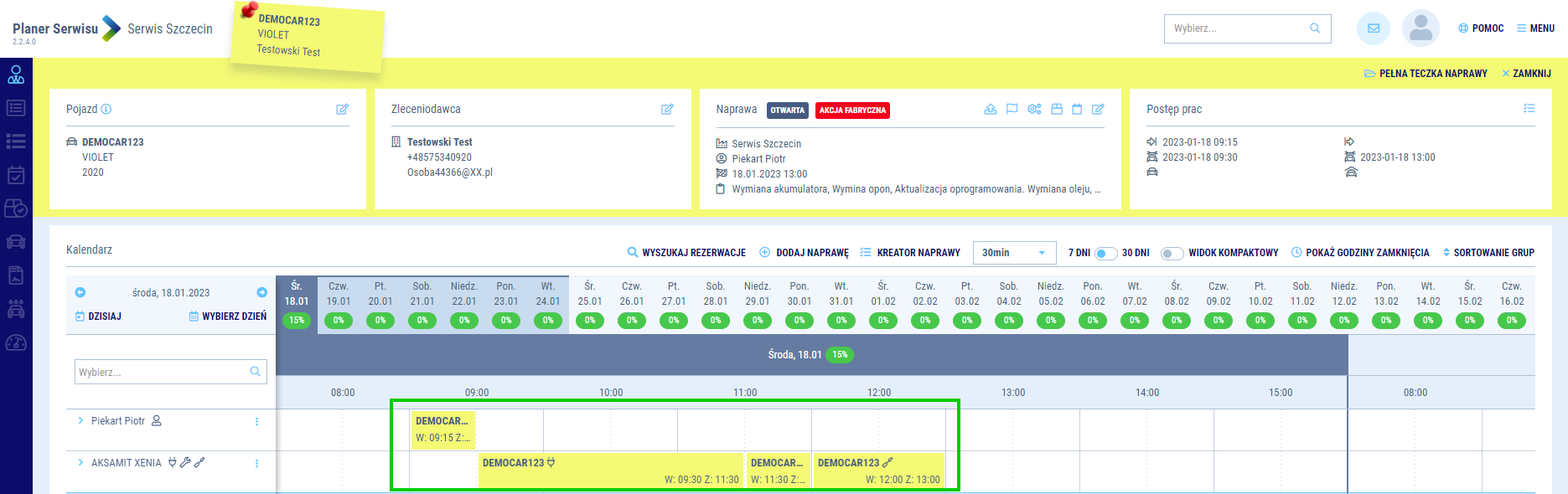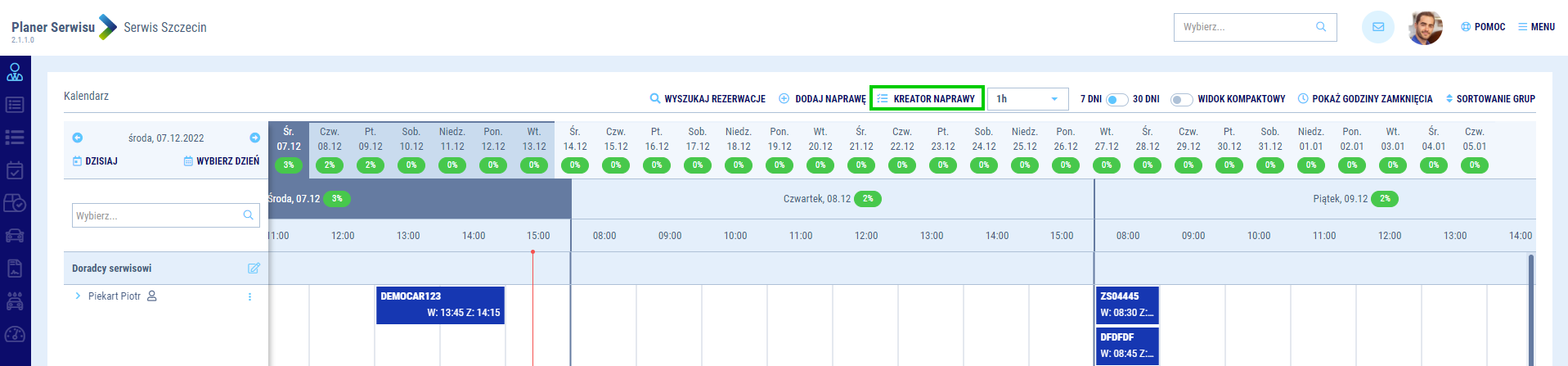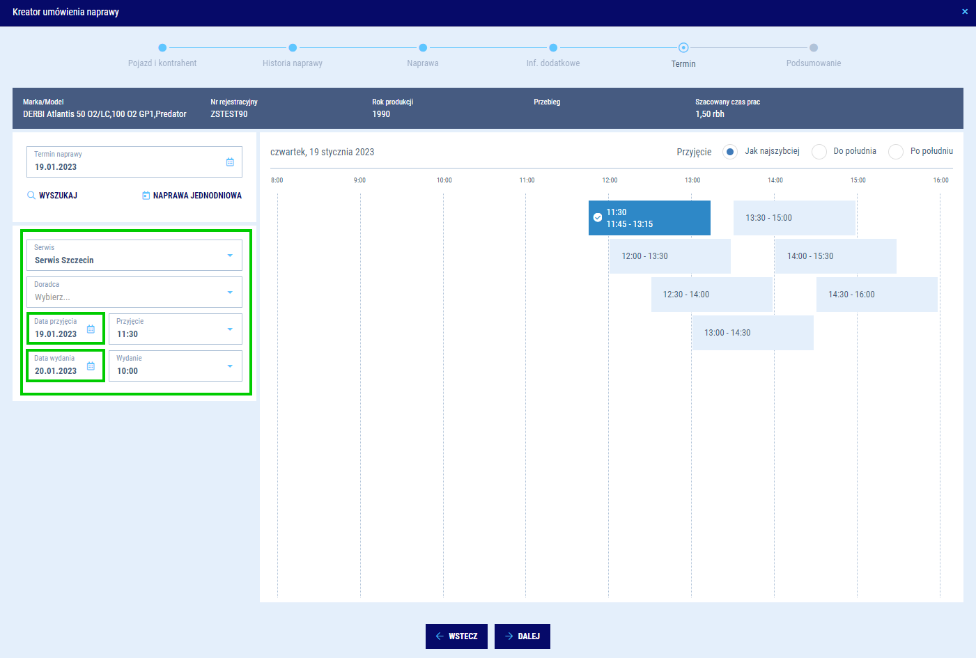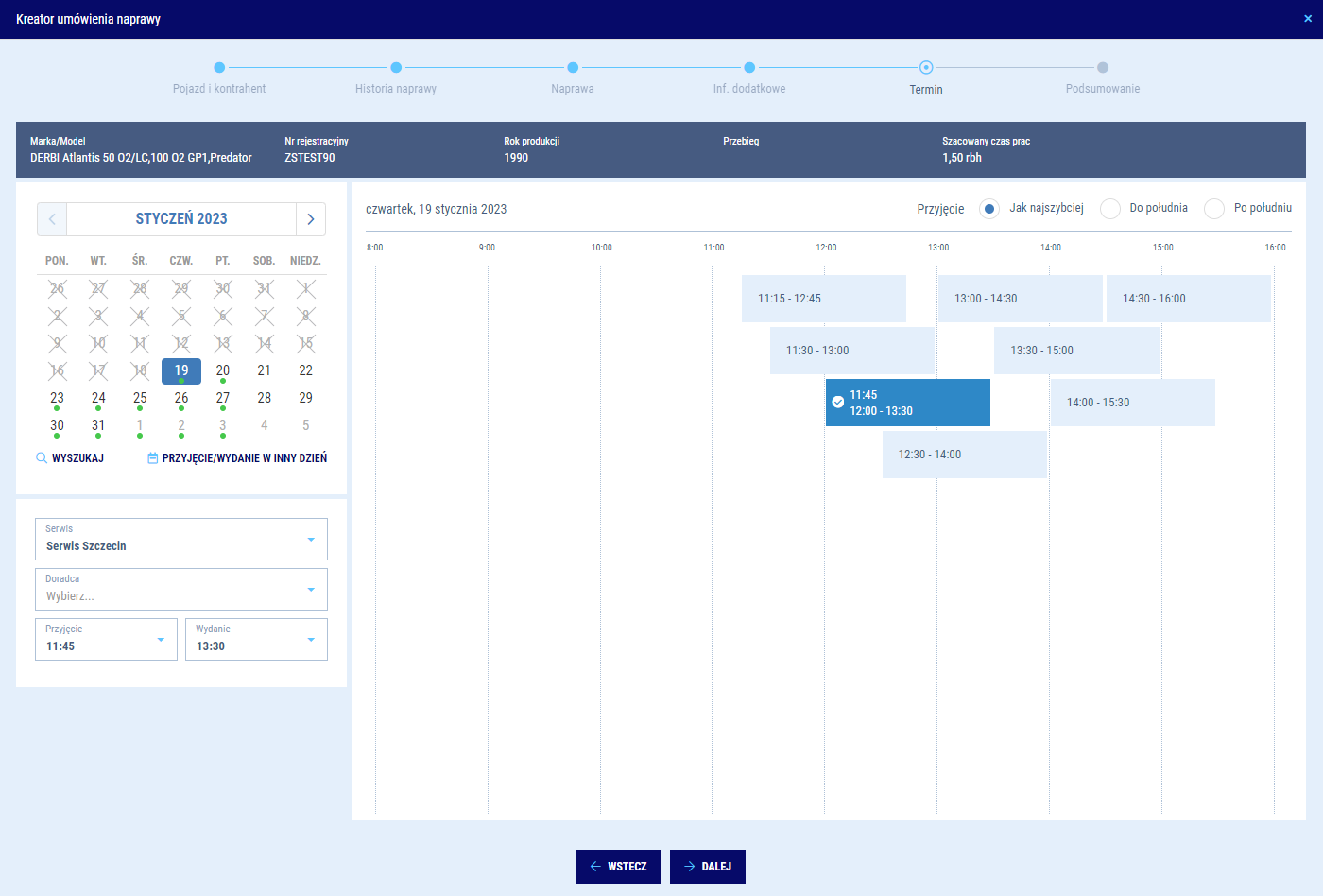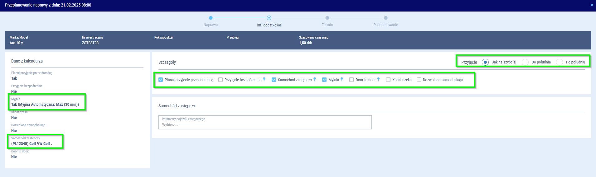 System będzie samodzielnie proponował Ci najbardziej optymalne terminy biorąc, pod uwagę dostępność doradców i mechaników. Jeżeli jednak zależy Ci, aby naprawa trafiła do konkretnego doradcy lub mechanika, to masz możliwość wskazania ich manualnie. Proponowane terminy ulegną zmianie adekwatnie do dostępności wybranych zasobów. Możesz również wybrać inny niż domyślny program mycia, jakie będzie zaplanowane dla naprawianego auta.