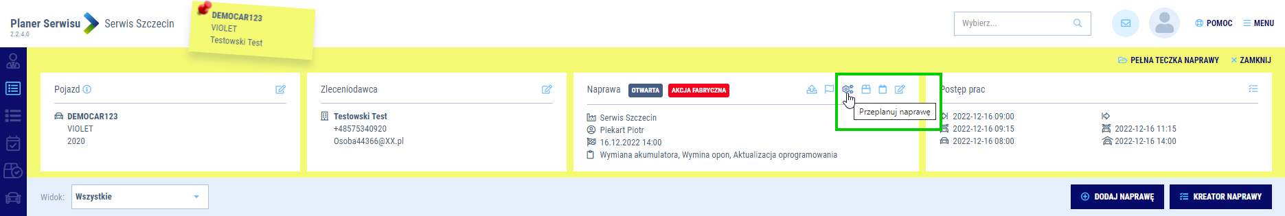 Jeżeli zachodzi taka potrzeba, masz możliwość przeplanowania całej naprawy na inny termin lub inny Serwis . Aby to zrobić odnajdź naprawę i otwórz kontekst naprawy. W sekcji Naprawa odnajdziesz ikonę