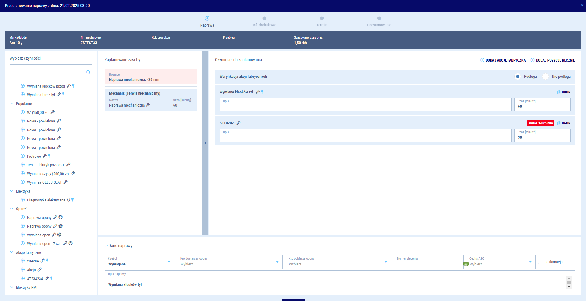 - Sekcja - Wybierz czynność - możesz dodać dodatkowe prace do naprawy