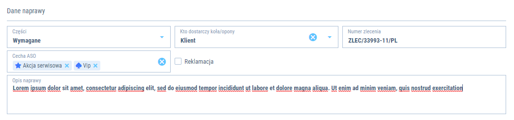 na jednej teczce naprawy możesz dodać maksymalnie cztery indywidualne cechy konfigurowane przez Twojego Administratora - Opis zlecenia