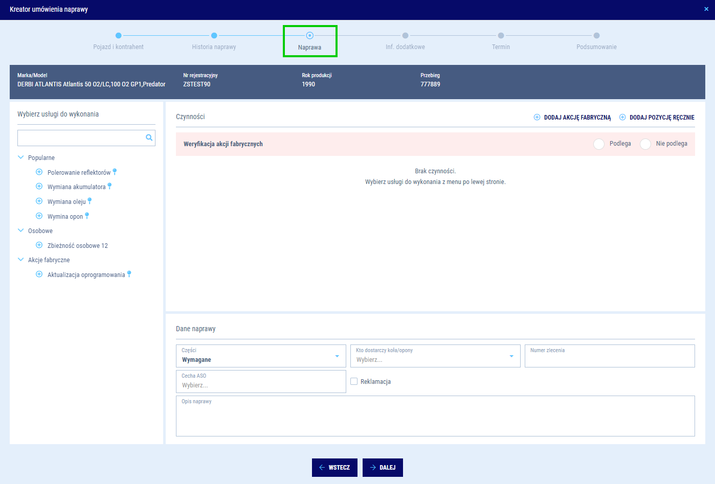 Kreator naprawy - weryfikacja akcje fabrycznych